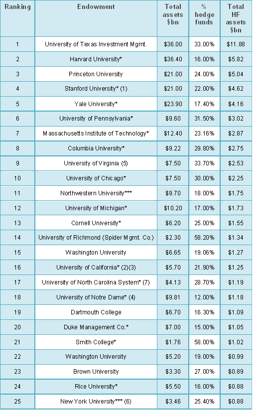 (1) Assets in absolute return; does not include long/short equity, which Stanford Management Co. includes in Public Equity but does not break out. (2) Asset total for all 10 schools in the UC system (3) Hedge fund weighted average for all 10 schools in the UC system (4) Marketable alternatives assets (5) Includes L/S equity and marketable alternatives and credit (6) Opportunistic and credit only; does not include long/short equity part of equity allocation as NYU does not break it out (7) Includes 19.1% l/s equity and 9.6% diversifying strategies, which includes multi-strategy, credit long/short and macro/commodities