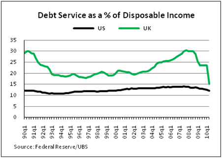 Recognising this vulnerability, the actions of the Fed since the onset of the crisis are easier to comprehend. With such a large quantum of debt it was imperative to reduce the cost of servicing it. Policy rates were cut to zero. However, the Fed’s aggressive interest rate cuts had only a mild impact on the servicing of household debt in America with its preponderance of callable fixed rate mortgages.  The effect was more pronounced in the UK where mortgage lending was predominantly variable and rates were previously priced off the one-year swap with only modest additional term and counterparty premium. Arguably, the institutional differences between the two countries’ mortgage markets made QE almost inevitable, in the US at least. Last year the Fed bid for probably a third of the outstanding stock of ten year Treasuries; the Fed’s holdings climbed from $450bn in early 2008 to $767bn at present day. But they had to concentrate the majority of their ammunition on purchasing mortgage backed securities, buying over a trillion dollars’ worth, to ensure that the cost of servicing the household sector’s debt would not rise on the back of elevated risk aversion in the banking sector. I salute this round of easing.