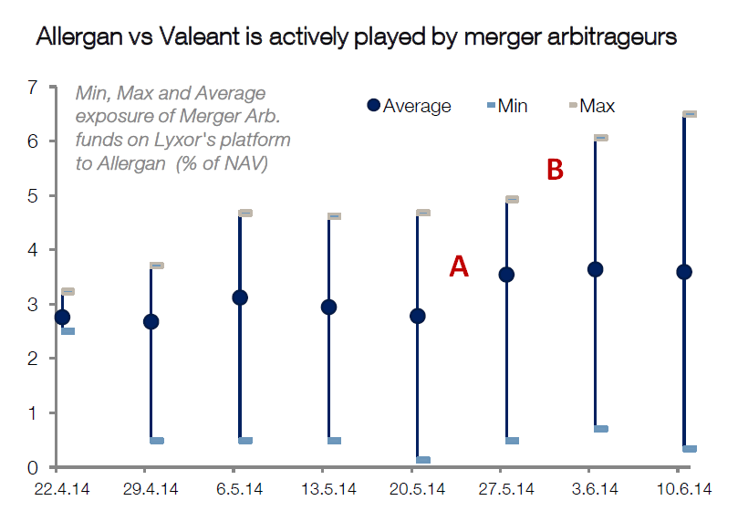 In the week marked A (20th-27th May) the typical merger arb fund (captured by the average exposure) expressed increasing confidence in the deal by adding just over half a percent to the existing Allergan position, taking the typical holding from around 2.8% to 3.4% (and the minimum exposure change confirms the additions).