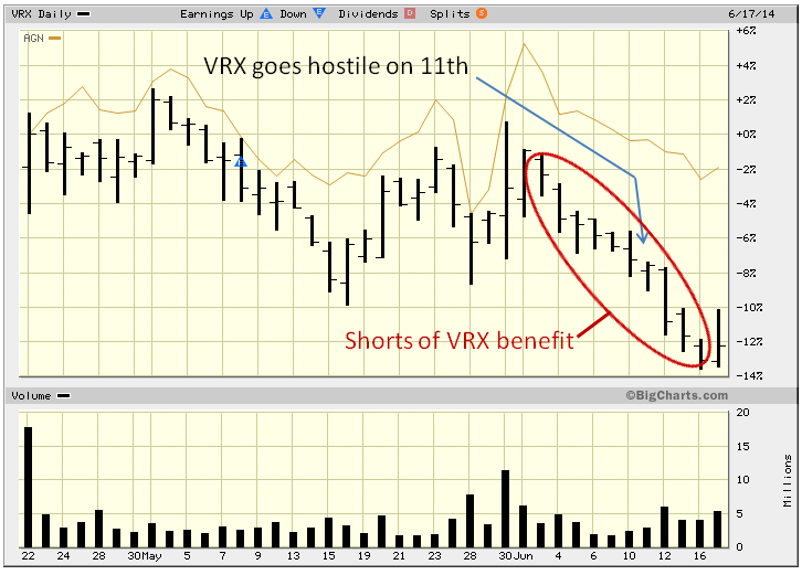 The Allergan vs. Valeant Pharmaceuticals International deal was the hottest spot this week.The graphic below shows the share price changes of the two stocks and the volume of trading of VRX since Valeant’s interest became public in April.