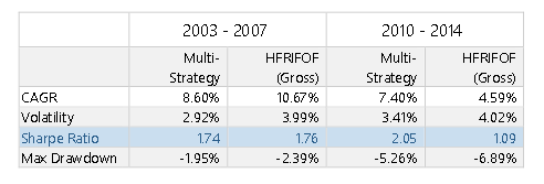 In the pre-crisis period, risk-adjusted returns between large multi-strategy funds and the HFRI Fund of Funds index (adjusted for the second layer of fees) were comparable. However, in the past five years, the Sharpe ratio of multi-strategy funds was almost double that of the typical fund of hedge funds.