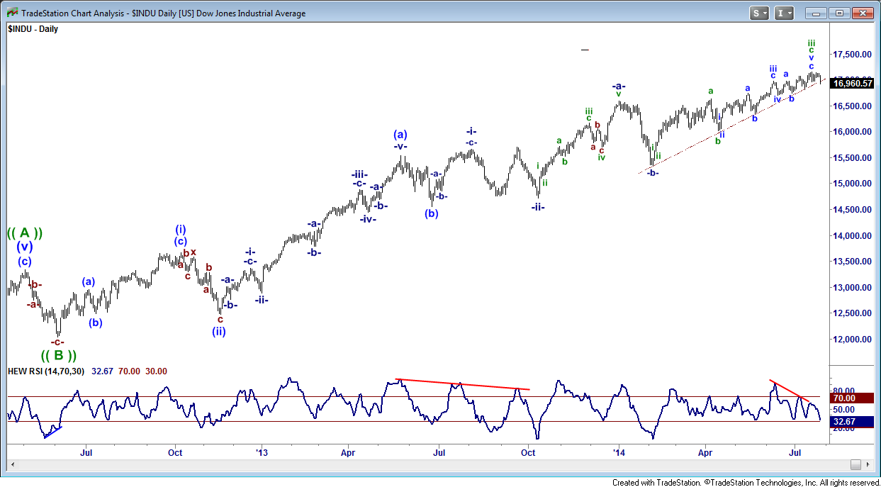 The purpose of this forecast, is to discuss the current situation. I shall provide charts and explanations for both the DOW and S&P. I am expecting an approximate 6% correction from current levels. This is based on both the structure and use of appropriate ratios that are the same across all wave degrees. Below is the daily chart of the DOW from the Wave (( B )) of Wave (( V )) (click on graphic to enlarge):
