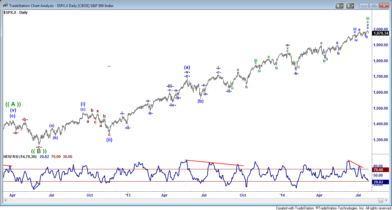 As a basic explanation of the methodology, Harmonic Elliott Wave utilizes a 3-wave process as opposed to 5-wave. This is where the wave relationships lie. Thus, the only waves that a 5-wave sequence will produce, is a Wave (a) or Wave (c). The Wave (i), Wave (iii) and Wave (v) are constructed of an (a)(b)(c) development. Wave (iii)’s must fall within standard projection clusters. The retracement ratios of the Wave (ii) and Wave (iv) are related – if Wave (ii) is deep then Wave (iv) will be shallow and vice versa. Wave (v) targets must match with the higher degree wave projection.