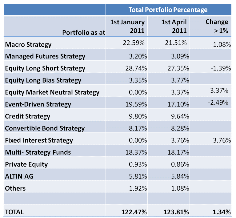 Sometimes reductions in allocations in portfolios of hedge funds are effected through a passive route. That is as flows come in, net new subscriptions are allocated to preferred strategies, and the strategies or managers with sufficient allocations at that point are diluted. But ALTIN is a closed-ended investment company, so the capital available to invest changes with new capital raisings on the stock exchange and with leverage. There have been no capital raising (in fact shares in ALTIN AG have been bought back), and leverage at the portfolio level is broadly the same over the first three months of the year. So in this case the reductions in allocations to strategy are active decisions based on a number of possible factors. The factors are views on prospective returns at the strategy or individual hedge fund level, and (fund of funds) portfolio composition issues. That is reductions may be driven by bottom-up factors (marginally high allocations to a single fund that needs to be trimmed after very strong performance or changes at the firm), or driven at the highest level of management (portfolio level leverage as a function of hedge fund returns across all strategies), as well as at the intermediate level of strategy allocation. In this case the changes seem to have been made at the intermediate level because two funds have been added that invest using investment strategies that were not represented in the portfolio at year end.