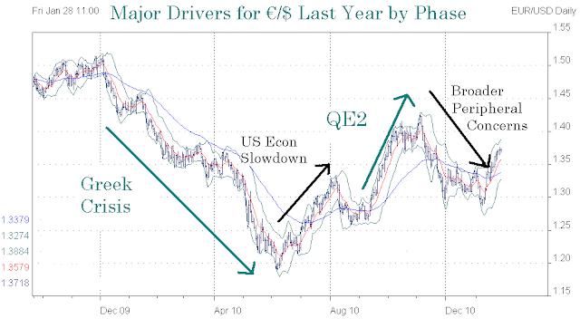 The third fundamental element to a good FX set up for a macro trader is the policy environment. Last year presented a classic opportunity (in looking at Euro related trades) in that European politicians/central bankers commented on levels and movements in traded rates (CDSs as well as bond auctions and FX parities). Some of the great macro trades have been set up by governments attempting to talk down markets when their policy objectives clash with what the markets discount as sustainable. So last year was a classic of its type in this regard, though interest rate policy specifically was a stale issue according to the bulge-bracket macro trader. That is, changes to interest rate policy were not expected to be a driver of the market condition for the trade under consideration in the time-frame envisaged. For trades at the market level like those illustrated here, and particularly in FX it is very important to understand the market drivers at the time. The graphic below indicates what the macro trader stated were the major drivers for the €/$ level last year through the different phases.