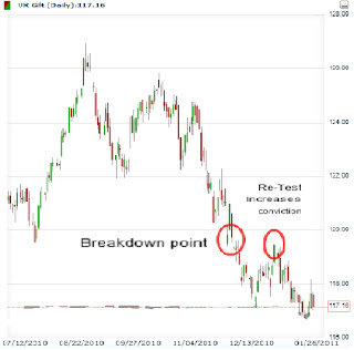 The significance from a money management perspective is that the second entry point – as the security price accelerates away from a key support or resistance level – can be a higher conviction entry point than the first. This is because the investment hypothesis (“the market is going to go down”, say) has been tested by market action and passed the test. So depending on style, the macro trader can trade in several risk units at the second entry point. In no way is the second entry point a secondary entry point!