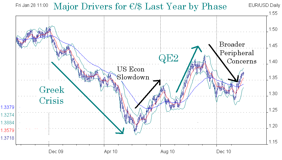 The third fundamental element to a good FX set up for a macro trader is the policy environment. Last year presented a classic opportunity (in looking at Euro related trades) in that European politicians/central bankers commented on levels and movements in traded rates (CDSs as well as bond auctions and FX parities). Some of the great macro trades have been set up by governments attempting to talk down markets when their policy objectives clash with what the markets discount as sustainable. So last year was a classic of its type in this regard, though interest rate policy specifically was a stale issue according to the bulge-bracket macro trader. That is, changes to interest rate policy were not expected to be a driver of the market condition for the trade under consideration in the time-frame envisaged. For trades at the market level like those illustrated here, and particularly in FX it is very important to understand the market drivers at the time. The graphic below indicates what the macro trader stated were the major drivers for the €/$ level last year through the different phases.
